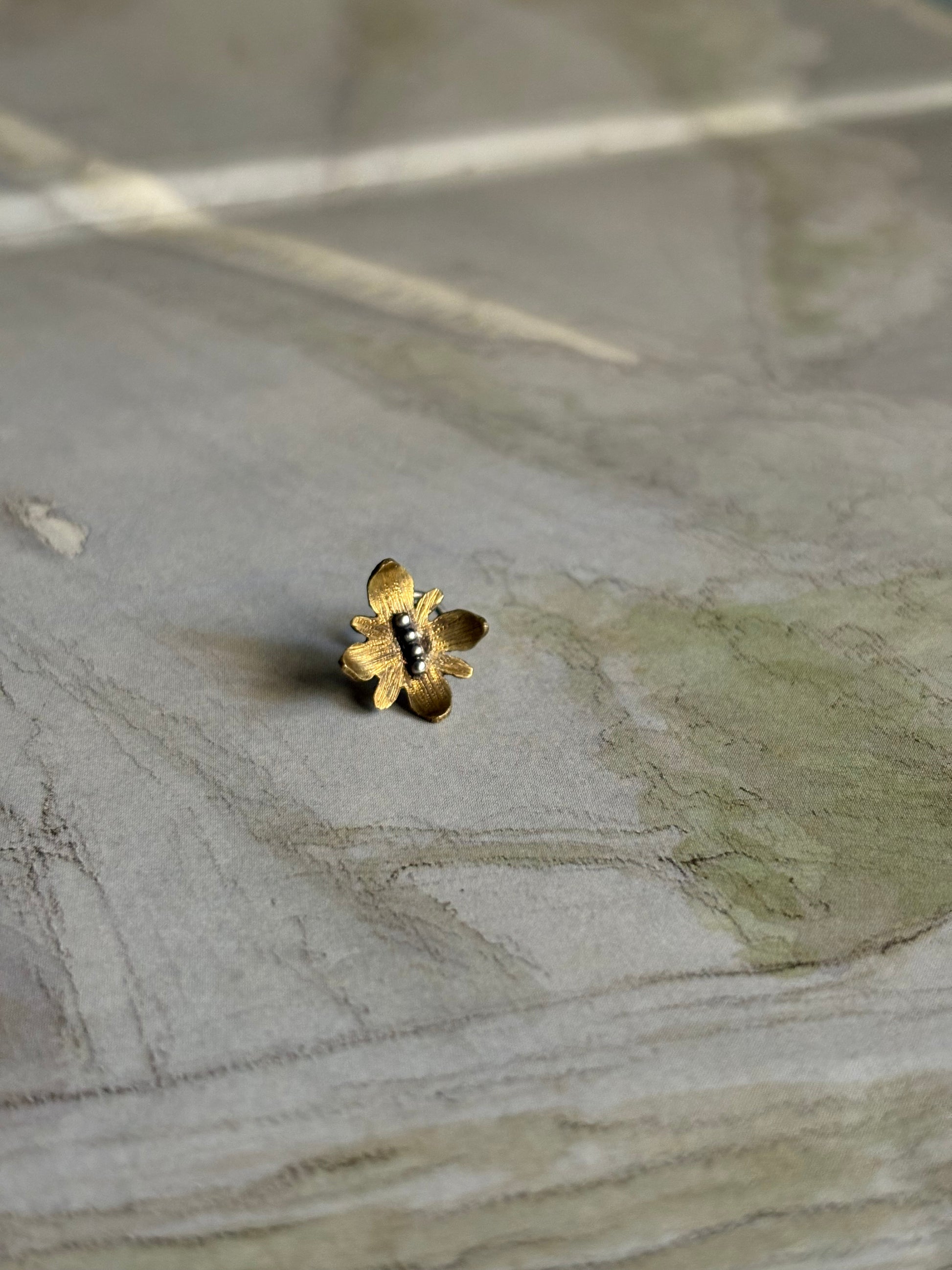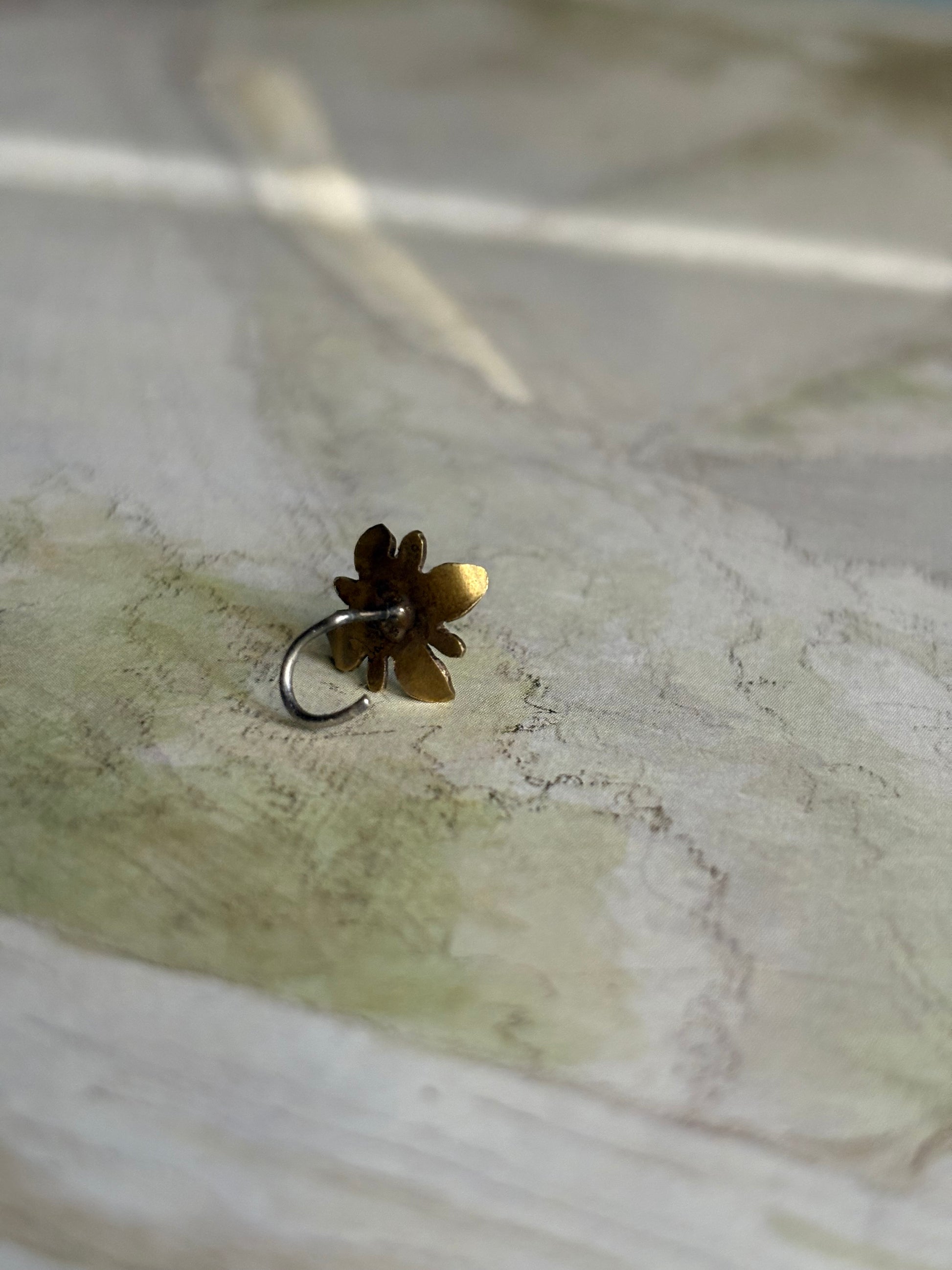 Hand cut mixed metal nose pin with grain accent.